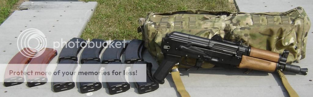 I can actually fit the gun with the stock extended, a mag already in it (if SHTF), and a filled four mag pouch all at the same time without it being too tight. I don't defend my apartment with an AKSU, but it is nice to have it all ready to rock and roll if ever needed. The side pocket is huge- I keep eyes, ears, oil, cleaning gear, and first aid stuff in it at all times.